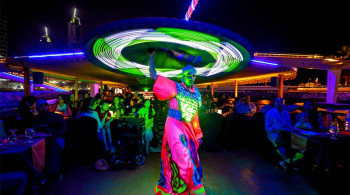 While you enjoy your drink and starters, you can take a look at the prestigious buildings and structures of Dubai, glittering in the night lights.